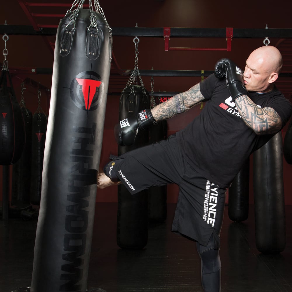 B) Kick the bag as hard as you can with your back foot. Switch stance to repeat on your opposite foot.