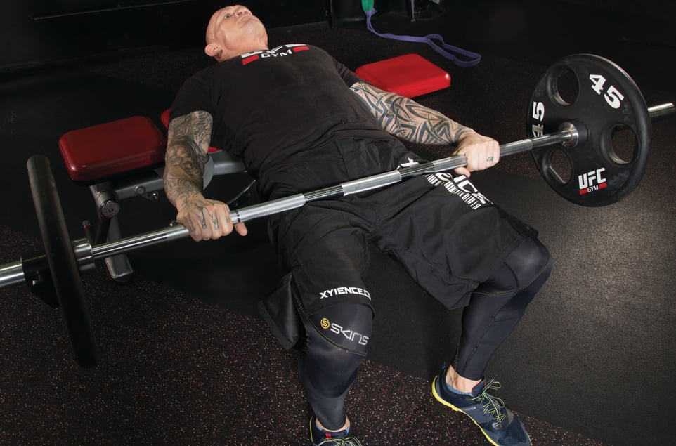 A) Position your upper back on the long side of a flat bench, with your feet flat on the floor, your knees bent. Get a training partner to place a loaded barbell across your lower abs.