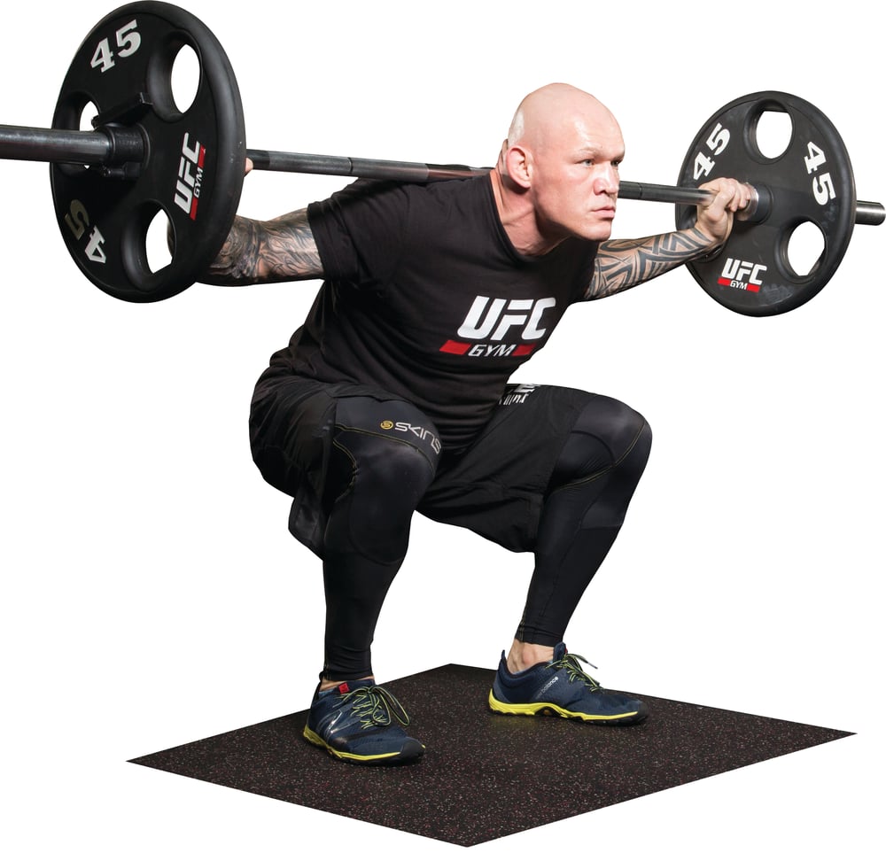 B) Bend your hips and knees simultaneously to lower yourself toward the ground. Stop when the bottoms of your thighs become parallel to the floor. Keep your back straight. Rise to the start position along the same path. The goal is to increase weight every set or every second set.