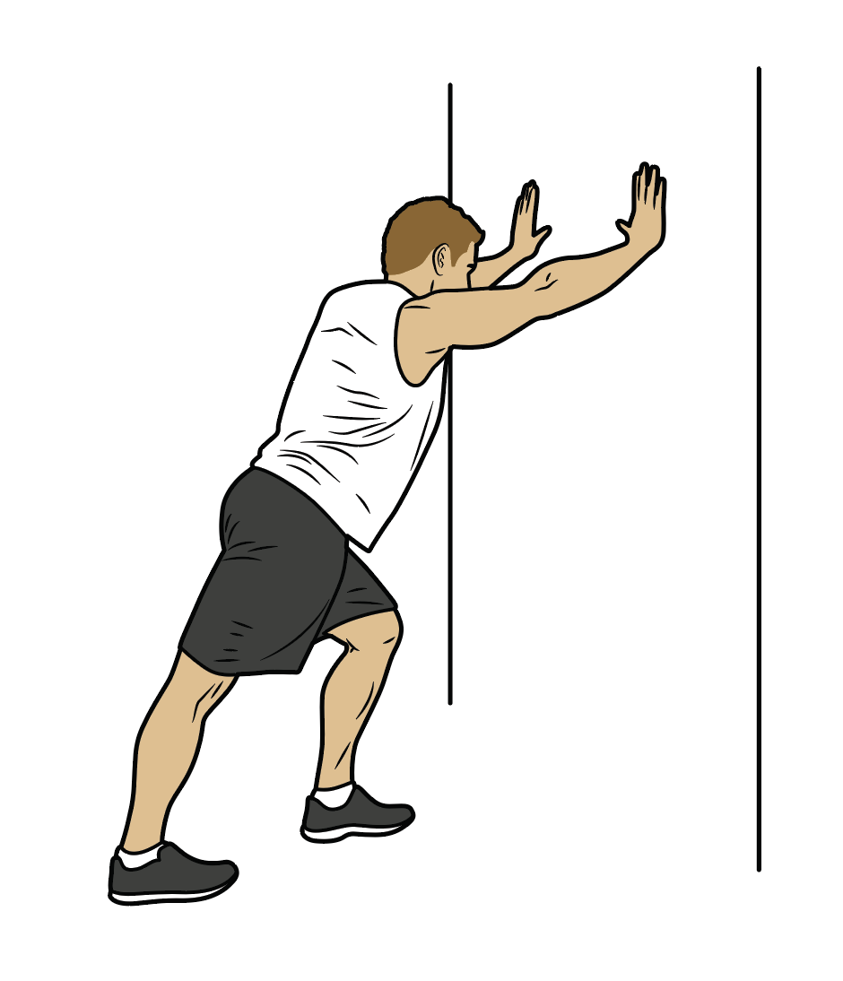 Stand facing a wall and place your hands on it. Position your feet in a lunge position and bend your back knee as far as possible without letting its heel rise off the ground. Do this for 30-60 seconds. Repeat on the other leg.