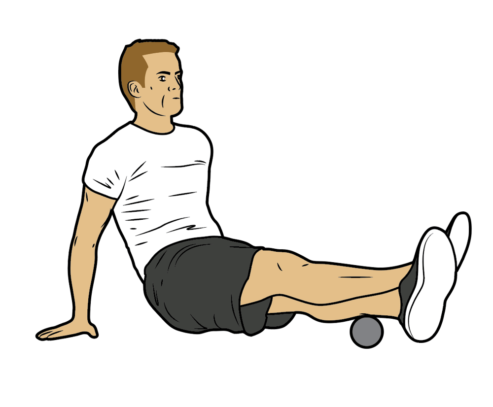 Sit upright on the floor with a tennis ball in line with your calves. Place your right foot on top of your left then place your left calf on the ball. Roll the ball left from to right and up and down to break down the fascia in that area and get more flexibility. Do this for 30-60 seconds on each leg.