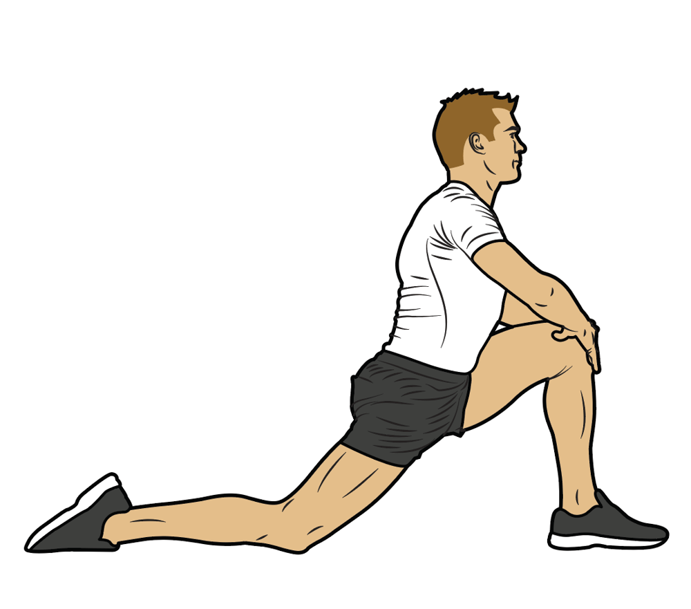 Get into a lunge position with your right foot forward. Lean even further forwards into it so that your back knee touches the ground. Hold for 30 seconds and repeat on the other side.