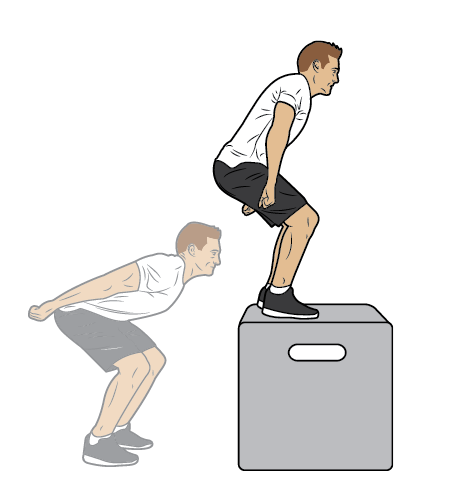 B) Bend your knees and hips so you drop into a quarter squat, then straighten your legs quickly to explode upwards and land on the box with both feet at the same time.