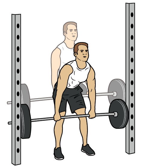 A) Set up in a power rack with the bar on the pins. Hold the bar in a deadlift position with a shoulder-width overhand grip, feet under your hips and an arched back.