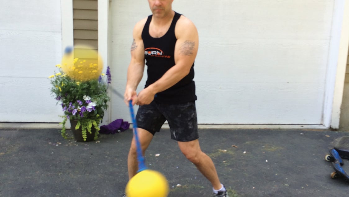 Take the same stance as the wall smash, but this time swing the ball across your body and upward, as if you were hitting a drive down the fairway in golf. Once you’ve done this exercise for a predetermined number of reps, do another set on your opposite side.