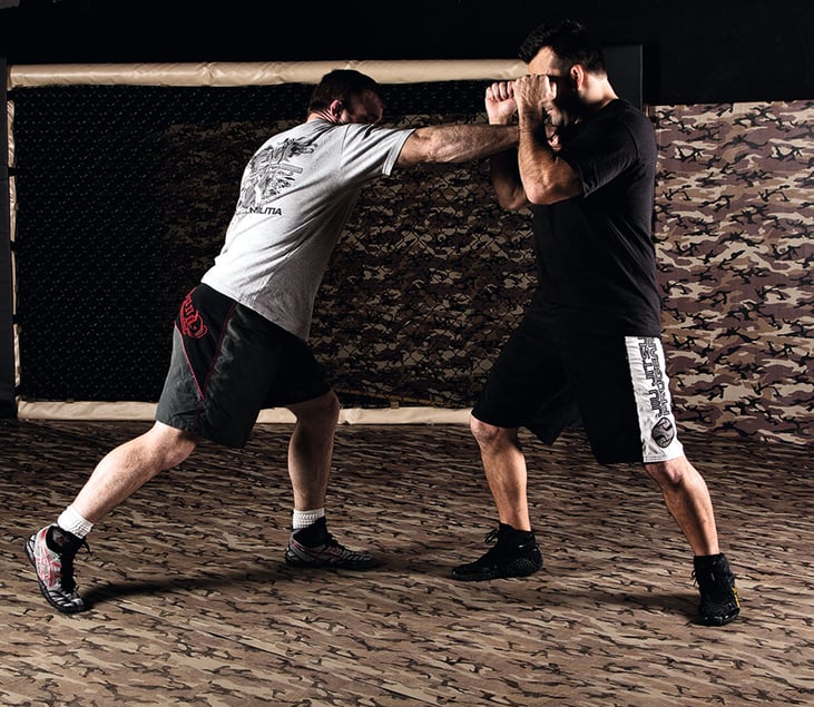 3. Matt drives into Kenny and lifts the leg transferring Kenny’s weight to his back leg. NOTE: Matt’s level is low, back is straight and his head is up and tight to the ribs.