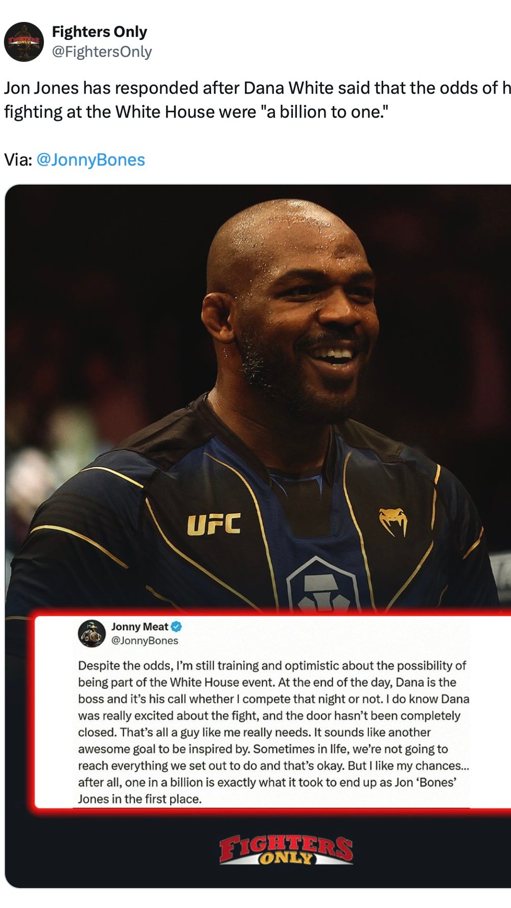 When Dana White said the chances of Jon Jones fighting at the White House were “a billion to one,” most fighters might have sulked. Not Jones. Instead, the GOAT hit X with a response that was equal parts motivational speech and mic drop. Whether this fight ever happens or not, Jones just reminded the world he’s always been the long shot who made it look inevitable.