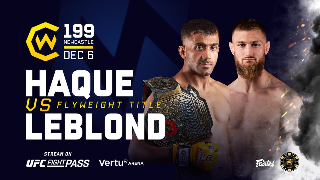 The organization’s flyweight championship will be on the line when 125-pound titleholder Shaj Haque looks to make his third successful defense against French powerhouse Nicolas Leblond at Cage Warriors 199 in Newcastle, England, on Saturday, December 6.