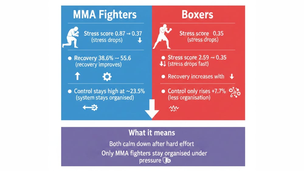 MMA unquestionably is the king of combat sports when you look at what the researchers discovered. When they put fighters from other disciplines through MMA-style training stress, 75% of the athletes from other combat sports didn’t have the physiological endurance to keep pace. Their heart's regulatory system buckled faster than expected. Some of the groups even saw 80-90% swings in their autonomic balance when the pressure spiked, which is the kind of heartbeat sharp rise you’d expect when you’re walking in the dark, expect a step, but your foot finds air and keeps falling. Even athletes like Greco-Roman wrestlers and national-level boxers saw their heart rate control spiral the moment their workloads stopped looking like the tidy, structured home sports they were used to. They’d all been conditioned for predictable tempos, like steady grappling pressure or clean striking exchanges that were repeatable. MMA pops that neatly in the bin and expects you to burst, scramble, clinch, sprawl, explode, stall, panic, breathe. Then repeat. The first muscle to go in this instance is the heart. And it’s why this organ needs special attention if you want to excel.