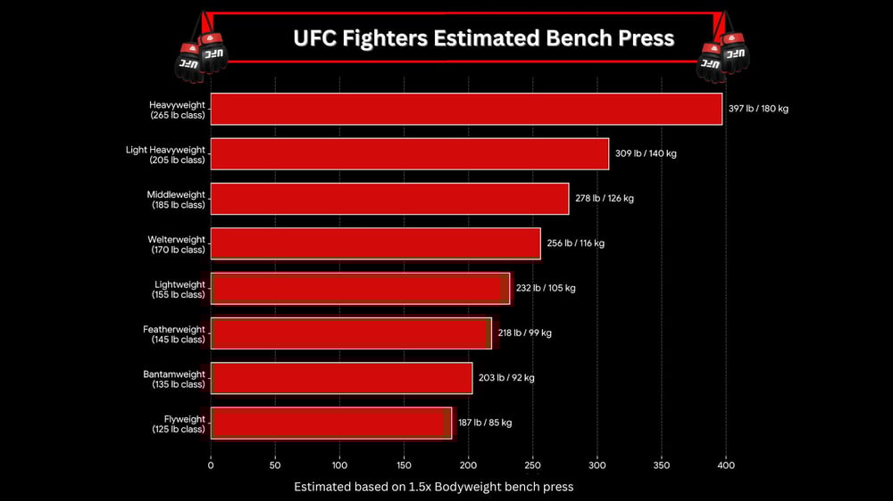 The bench might get a second wind when you realize real fighters use it, perhaps not in the hyperbolic ways listed in the infographic which shows the extreme ends of the scale. McGregor is rumored to bench 265lb, while Jones has been filmed benching 220lb for 10 reps, which is about a 300lb 1-rep max. When a study compared lightweight and heavyweight MMA athletes, split by pros and elite levels, the bench press was one of the few tests that separated the packs. Elite heavyweights pressed roughly 258lb while elite lightweights hit about 180lb. All of that means little until you find what that pec strength was married to: isometric lumbar strength. The bigger the press, the stronger the lower back tended to be. This part of you acts like a middle manager controlling the flow between the upstairs and downstairs work. It matters for force transfer, positional survival, and injury prevention. Unlike bench press muscles, it’s not flashy (possibly the least flashy), but it keeps you in the game, especially when you’re wrestling and grappling. That link becomes clearer when you understand that another long-term study found MMA fighters improved their strength endurance by nearly 27%, alongside gains in max strength and late-fight technical effectiveness after 18 weeks of structured barbell work using moves like the bench press and squats. They lifted more but also ended up being fight functional for longer. The bench itself isn’t flashy, but when it rides shotgun with trunk stiffness and endurance. This means it helps keep fighters dangerous when that Round 3 fatigue becomes a reality.