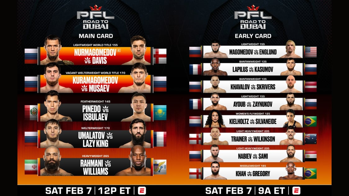 - PFL Lightweight World Title Main Event: Usman Nurmagomedov (20-0-0, 1 NC) vs. Alfie Davis (20-5-1)